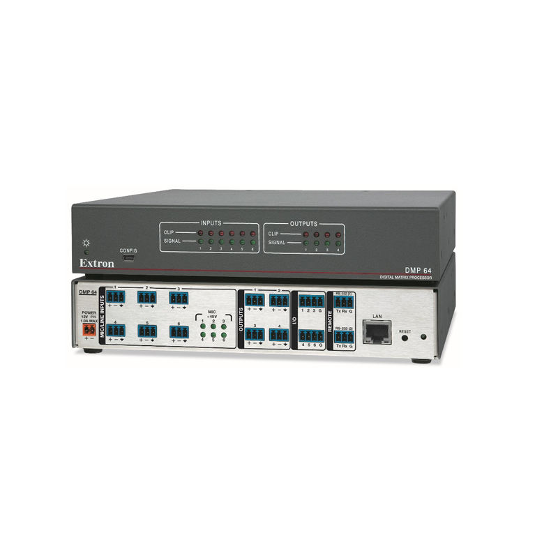 The Extron DMP 64 is a compact, half‑rack audio matrix processor offering six mic/line inputs and four outputs. Powered by ProDSP™ (32/64‑bit floating‑point), it enables precise audio mixing, DSP processing, and room optimization through Extron’s intuitive DSP Configurator™ software—ideal for boardrooms, classrooms, or corporate AV setups.