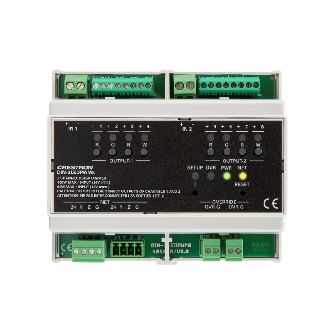 The Crestron® DIN-2LEDPWM8 is a two-channel RGBW LED dimmer designed for DIN rail mounting. Utilizing PWM technology, it ensures smooth, flicker-free dimming and integrates seamlessly with Crestron control systems via Cresnet®.